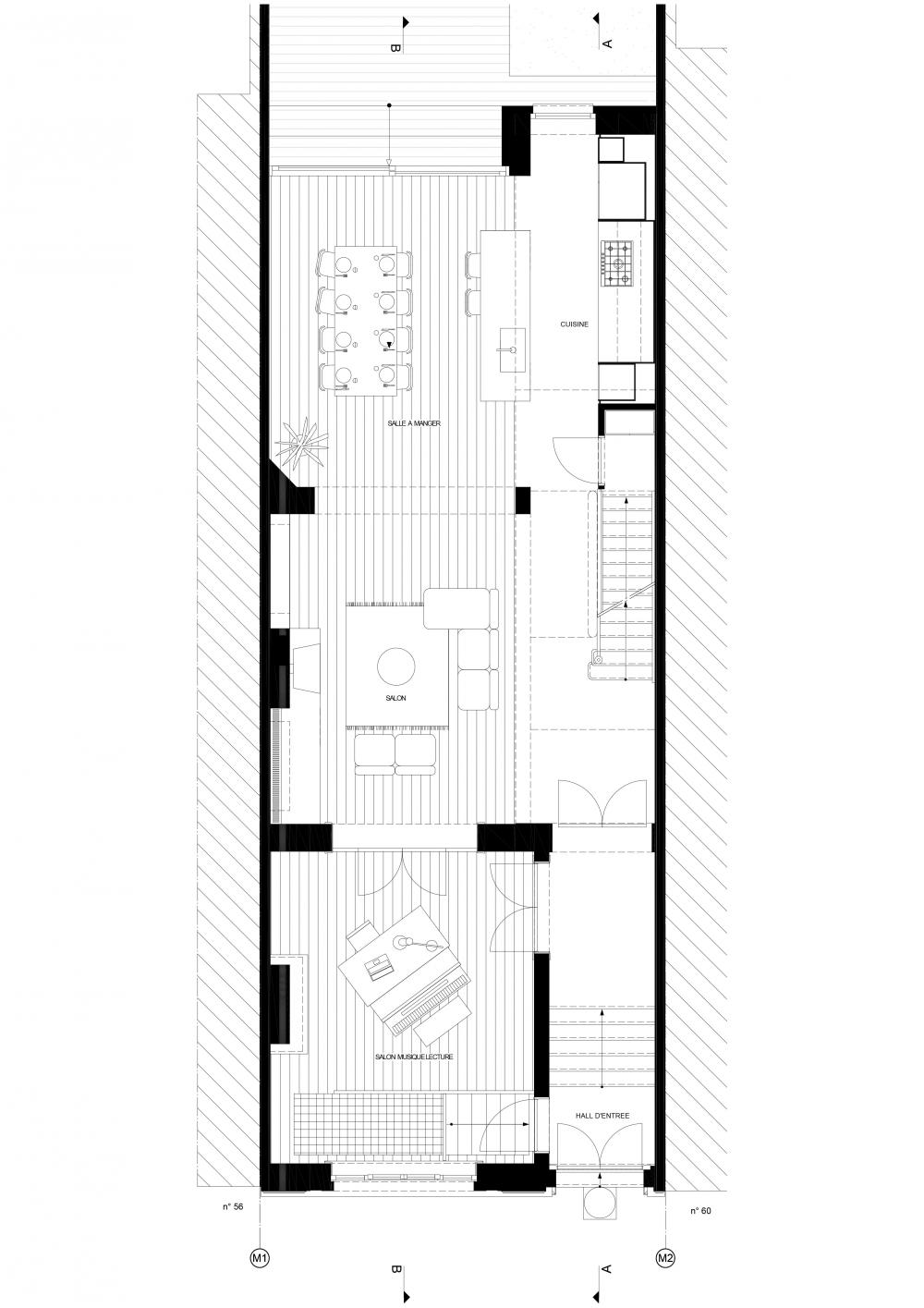 Tout en respectant le programme de base, l’intervention principale migre de la classique extension en façade arrière vers la cage d’escalier qui devient le chœur de la vie des futurs occupants.